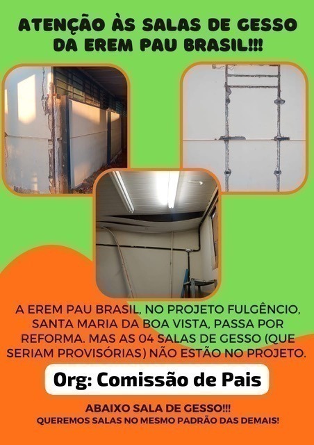 Os Pais de alunos e a comunidade do Projeto Fulgêncio e da Escola de Referência em Ensino Médio Pau-Brasil, localizada no Projeto Fulgêncio – Núcleo Principal, pedem ao Governo do Estado, e a governadora, Raquel Lyra, que numa obra que está acontecendo na mesma escola, se construa 4 salas de aula no lugar das precárias salas de gesso.