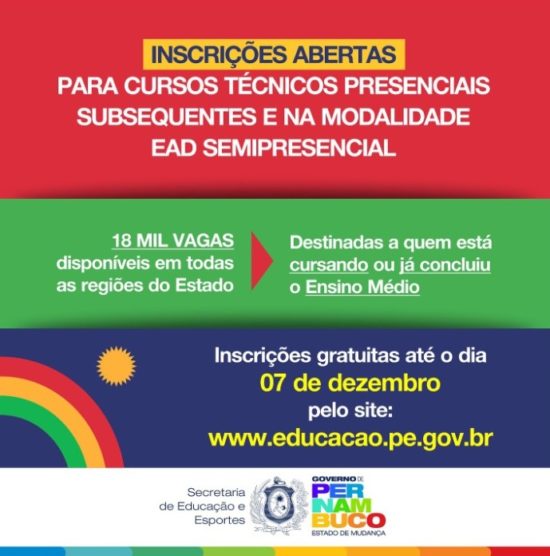 Começaram nesta terça-feira (28) as inscrições para 18.209 vagas em cursos técnicos gratuitos subsequentes na modalidade presencial e para Educação a Distância (EAD) semipresencial. As inscrições gratuitas devem ser feitas até 7 de dezembro pelo site da Secretaria de Educação e Esportes de Pernambuco.