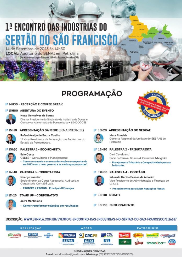 Inscrições: https://www.sympla.com.br/1-encontro-das-industrias-no-sertao-do-sao-francisco__2116627