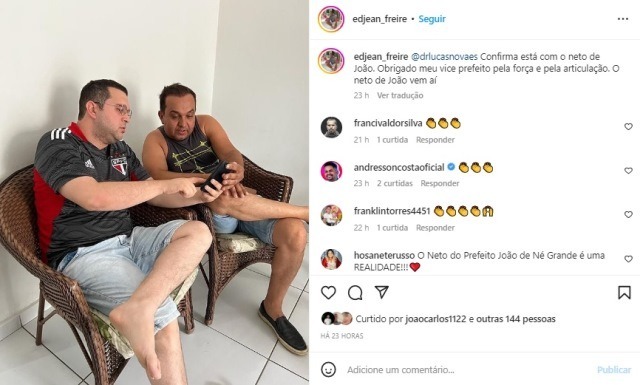 Confira a postagem: “@drlucasnovaes Confirma está com o neto de João. Obrigado meu vice prefeito pela força e pela articulação. O neto de João vem aí.”