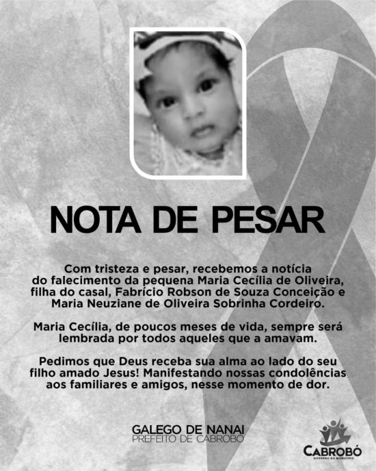 Com tristeza e pesar, recebemos a notícia do falecimento da pequena Maria Cecília de Oliveira, filha do casal, Fabrício Robson de Souza Conceição e Maria Neuziane de Oliveira Sobrinha Cordeiro.