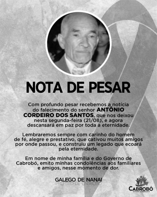 Com profundo pesar recebemos a notícia do falecimento do senhor ANTÔNIO CORDEIRO DOS SANTOS, que nos deixou nesta segunda-feira (21/08), e agora descansará em paz por toda a eternidade.