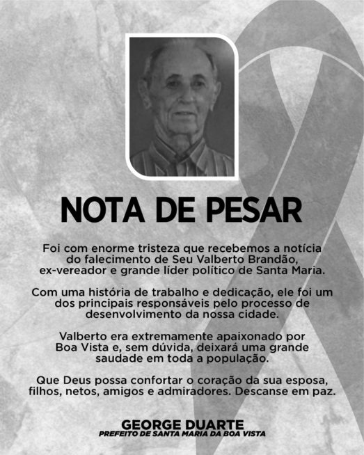 Valberto era extremamente apaixonado por Boa Vista e, sem dúvida, deixará uma grande saudade em toda a população. Que Deus possa confortar o coração da sua esposa, filhos, netos, amigos e admiradores. Descanse em paz.