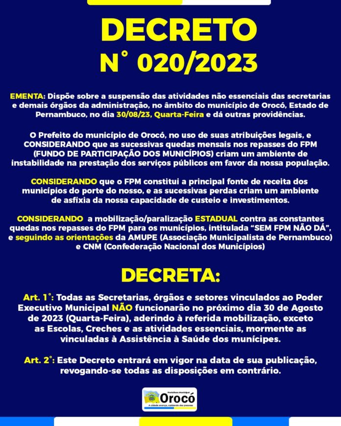 A Prefeitura Municipal de Orocó vai aderir nesta quarta-feira (30) ao movimento de protesto contra a queda constante dos repasses do Fundo de Participação dos Municípios (FPM).