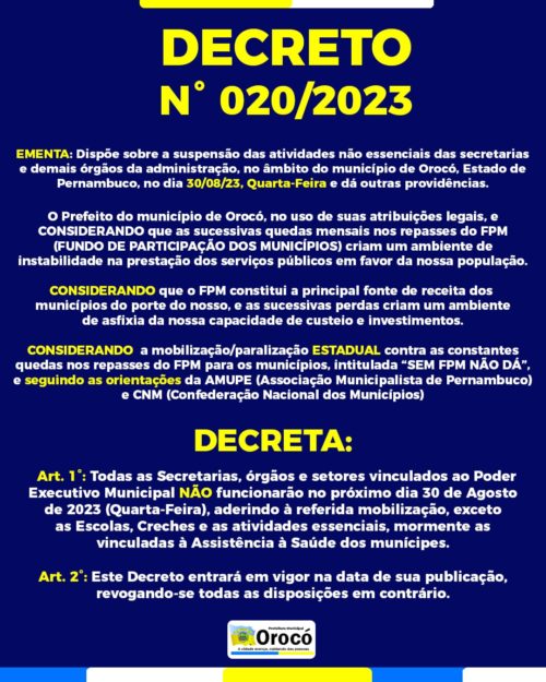 O Governo Municipal de Orocó deixa claro que essa paralisação não é apenas um ato de protesto, mas um apelo pela sobrevivência das estruturas municipais diante das dificuldades financeiras cada vez mais intensas. A situação reflete a necessidade crucial de uma revisão nos repasses governamentais para que as cidades possam cumprir suas responsabilidades básicas e continuar a fornecer serviços essenciais à população.
