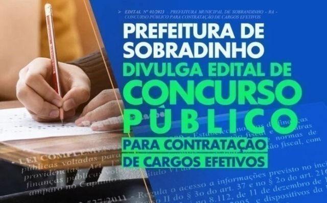 A Prefeitura Municipal de Sobradinho no uso de suas atribuições legais anuncia a abertura das inscrições para o Concurso Público destinado ao preenchimento de diversas vagas para os níveis fundamental, médio e superior. Todas as vagas serão disponibilizadas de acordo com as demandas da administração municipal, em suas unidades organizacionais, que estão localizados tanto na zona urbana quanto na zona rural do município.