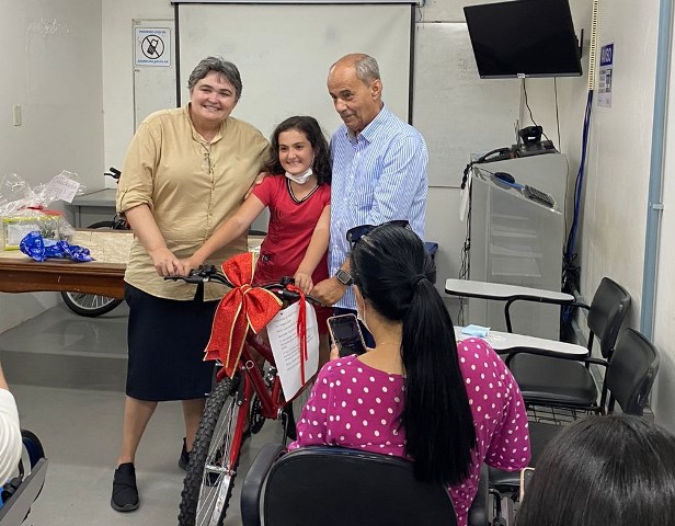 Geovanna, de 7 anos, era só sorrisos enquanto recebia das mãos da Superintende do Instituto Social Medianeiras da Paz (Ismep), Irmã Fátima Alencar, e do Presidente da Federação dos Hospitais filantrópicos de Pernambuco (FEHOSPE), Gil Brasileiro, a bicicleta dos sonhos. Geovanna é uma das 30 crianças que fazem tratamento contra o câncer no Hospital Dom Malan em Petrolina, no Sertão do Estado, contemplada com o ‘Dia do Desejo’.