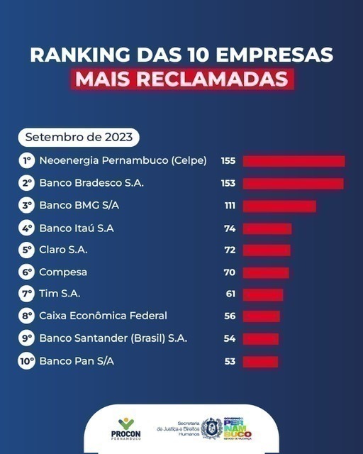 Ocupando a primeira posição do ranking está a Neoenergia, que foi alvo de 155 reclamações. Na lista da empresa, além da cobrança por serviços não realizados, também estão os consumos elevados e os defeitos na medição. Em 2° lugar, aparece o Banco Bradesco S.A , alvo de 153 queixas, com destaque em suas cobranças abusivas, para alterar ou cancelar contratos, e cobranças por serviços não solicitados.