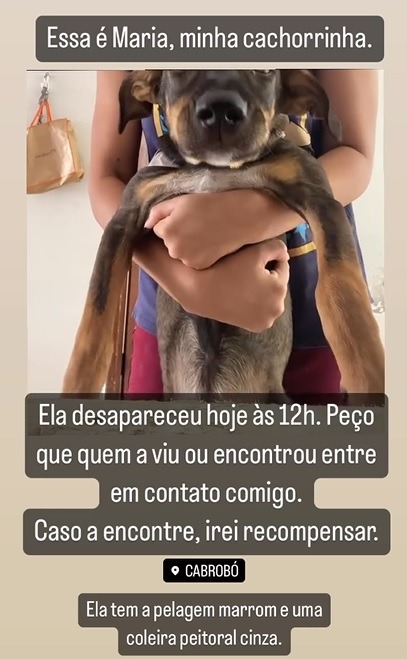 A dona da Cachorrinha que atende por Maria está à procura da mesma, ao tempo que pede a quem souber seu paradeiro entrar em contato com Juliana Gomes pelo celular (87) 9.9662-9218 ou Gabriela Conrado (87) 9.9961-9863.