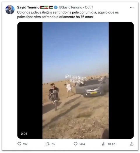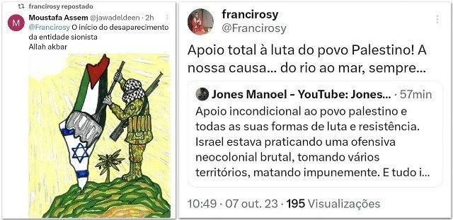 Francirosy Barbosa, que leciona antropologia na USP (Universidade de São Paulo) no campus de Ribeirão Preto e é especialista em estudos sobre o Islã, também fez uma postagem em seu perfil onde declarou “apoio total à luta do povo palestino”. Depois, ela apagou seu perfil no X.