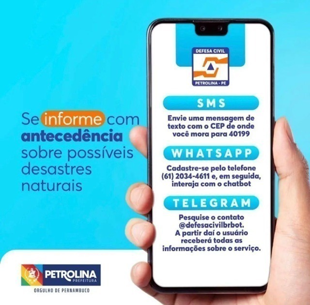 A Defesa Civil de Petrolina presta um serviço gratuito de envio de mensagens de alerta de riscos desastres e emergências. É uma forma fácil de receber boletins de avisos e alertas extremamente importantes. Além do mais, permitem que os cidadãos estejam preparados e possam redobrar a observação em suas comunidades.