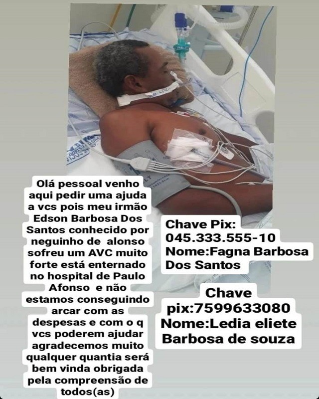 Edson Barbosa dos Santos, conhecido como ‘Neguinho de Alonso’, sofreu um AVC e está internado no Hospital de Paulo Afonso-BA. Sua família não consegue arcar com todas as despesas, e por isso contam com a solidariedade de todos.