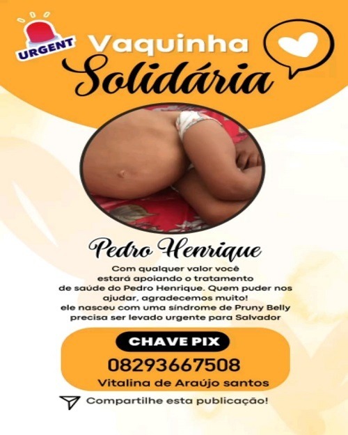 Com qualquer valor você estará apoiando o tratamento de saúde do Pedro Henrique. Quem puder ajudar a família agradece imensamente. Pedro Henrique nasceu com uma sindrome de Pruny Belly precisa ser levado urgente para Salvador.